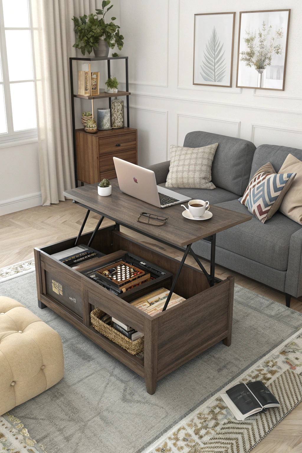 - A coffee table that lifts to become a workstation