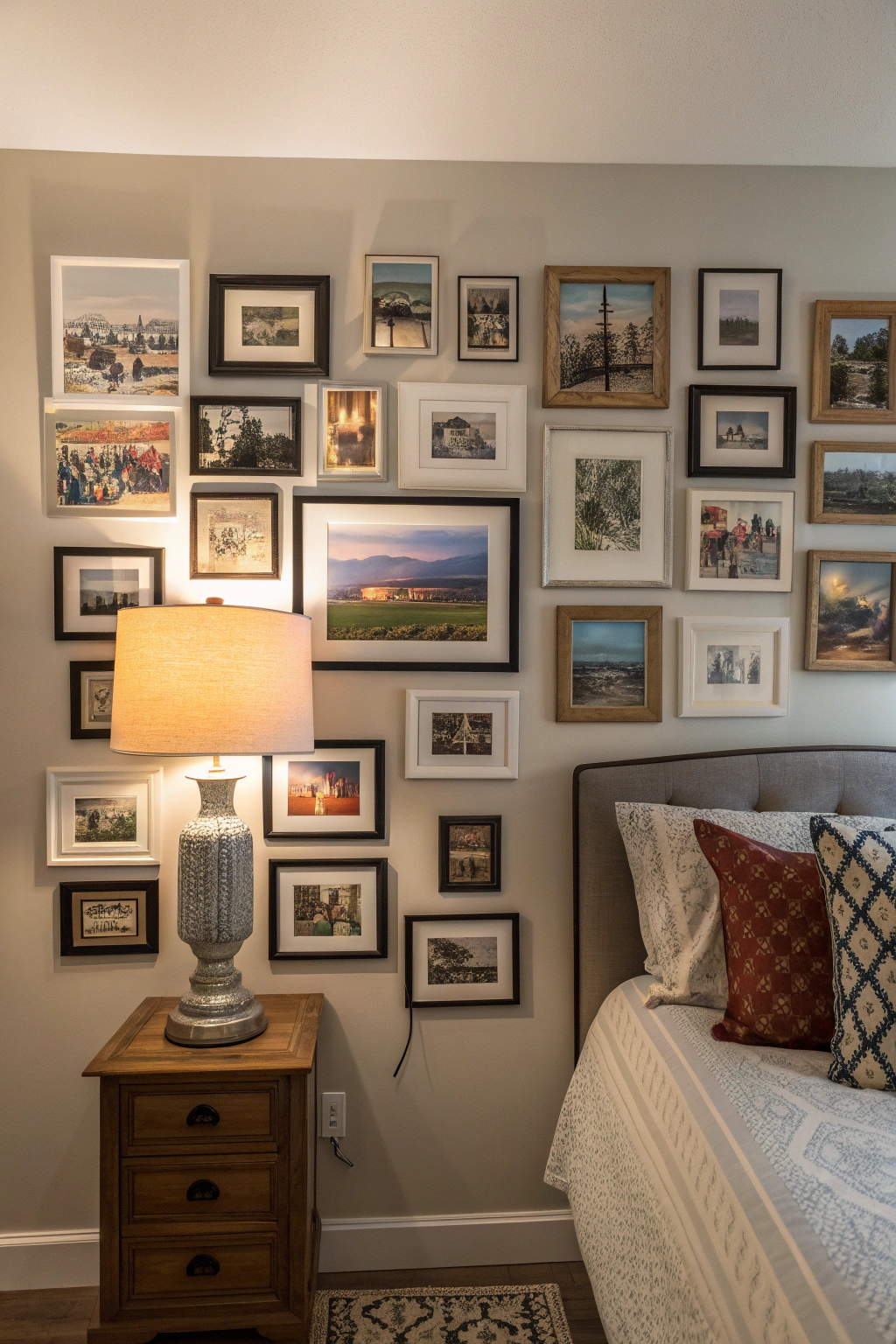 Creating a bedroom accent wall with a creative photo collage can add a personal touch that reflects your unique style and cherished memories. Choose a collection of your favorite photos—whether they’re family, friends, or travel adventures. Use different frame sizes for visual interest, and arrange them in a pattern that resonates with you. This wall will instantly become a focal point of warmth and nostalgia.