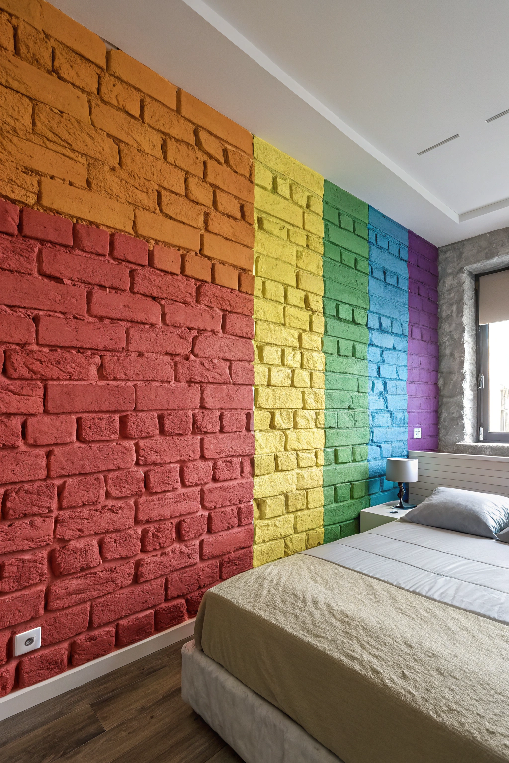 Incorporating colorful masonry techniques can add texture and vibrancy to your bedroom accent wall. You might consider using bold paint colors on brick or stone surfaces to create an eye-catching backdrop. Additionally, you can mix different shades for a mosaic effect, or even use colored mortar for a unique twist. Experimenting with these options allows you to express your style creatively and dramatically.