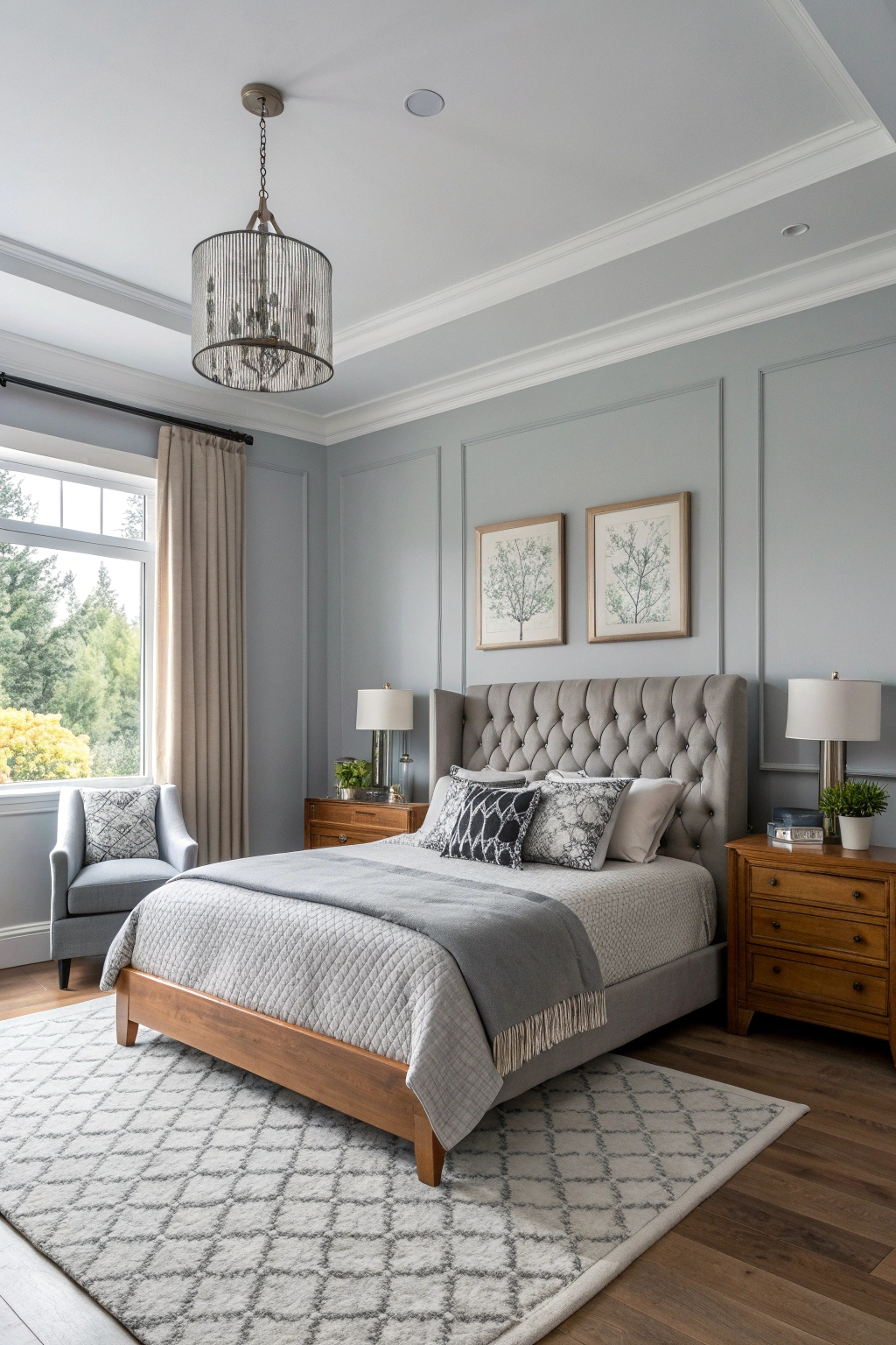 - Warm taupe accents like bed linens or curtains.
