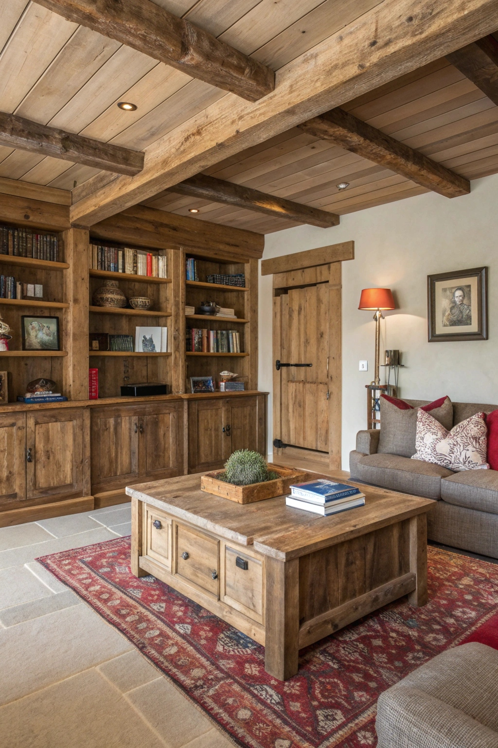 Incorporating reclaimed wood elements into your living room instantly adds character and warmth to the space. You can choose rustic wooden beams for the ceiling or opt for reclaimed wood furniture, like a coffee table or side tables. Adding wooden shelves showcases your style while providing storage. These elements not only enhance aesthetics but also promote sustainability by breathing new life into old materials.