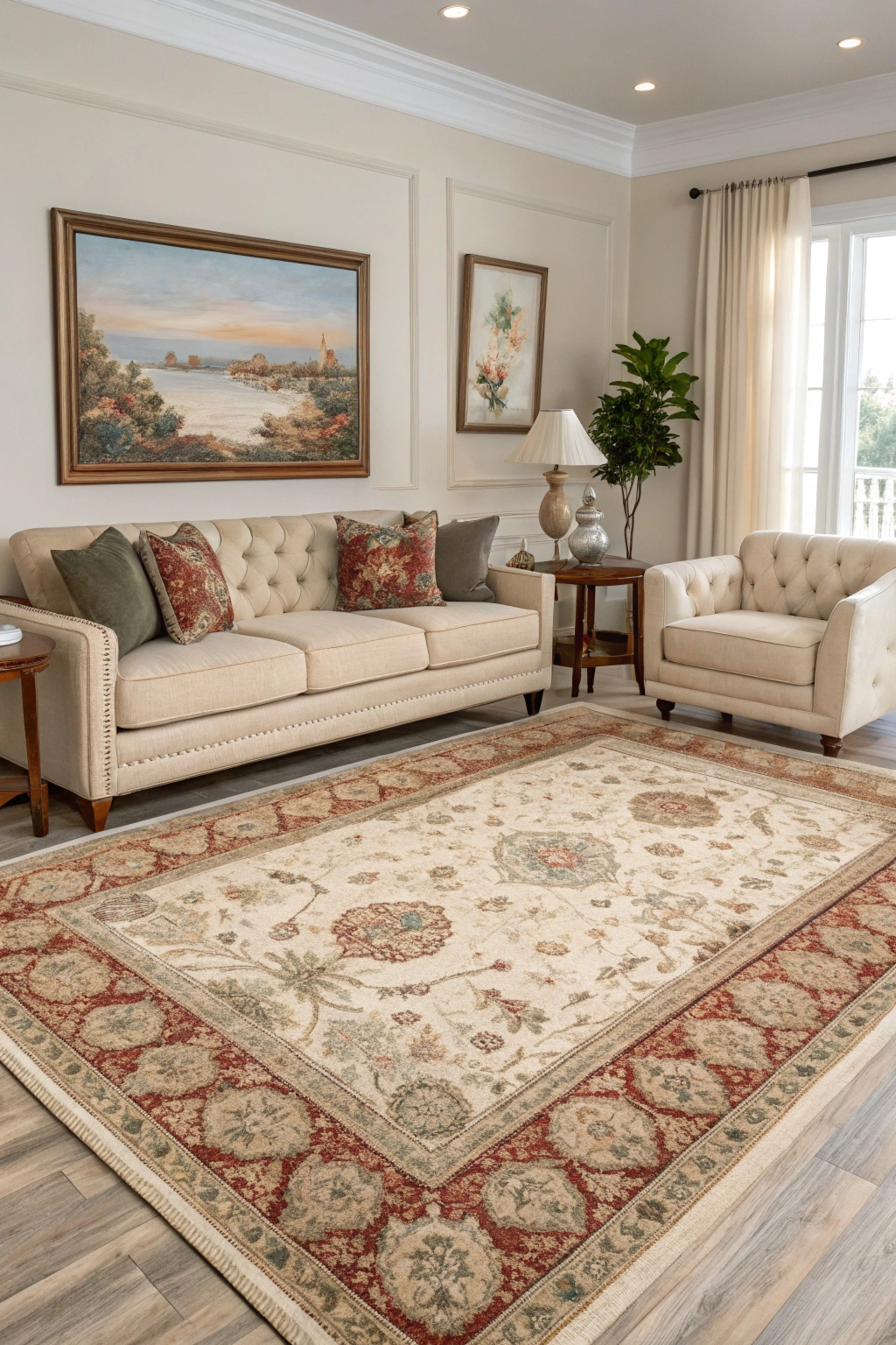 Incorporating timeless area rugs can enhance your living room’s aesthetic while complementing the statement artwork you’ve chosen. Opt for classic patterns like Persian or Oriental designs, which add depth and warmth. Choose colors that harmonize with your palette. Make sure the rug’s size defines your space, bringing cohesion and comfort. With the right area rug, your living room will feel inviting and beautifully curated.