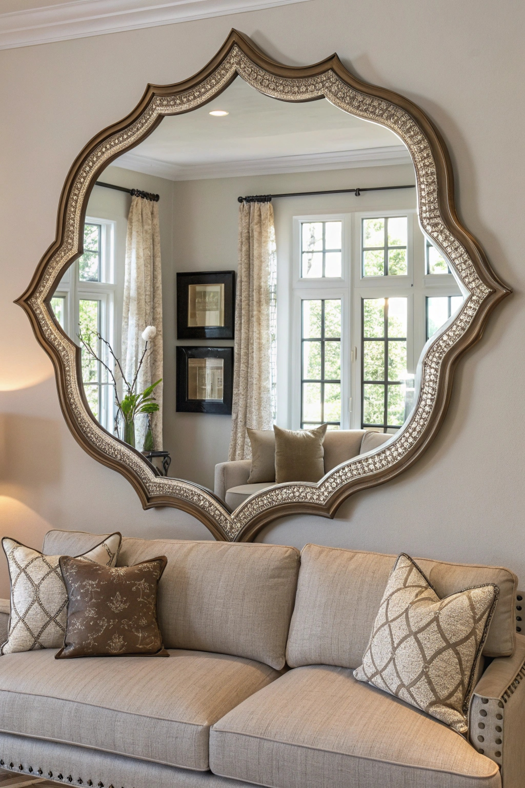 Wall mirrors aren’t just practical—they’re also a fantastic way to elevate your living room’s style. They reflect light, create the illusion of space, and serve as stunning focal points. When choosing an artistic wall mirror, consider: