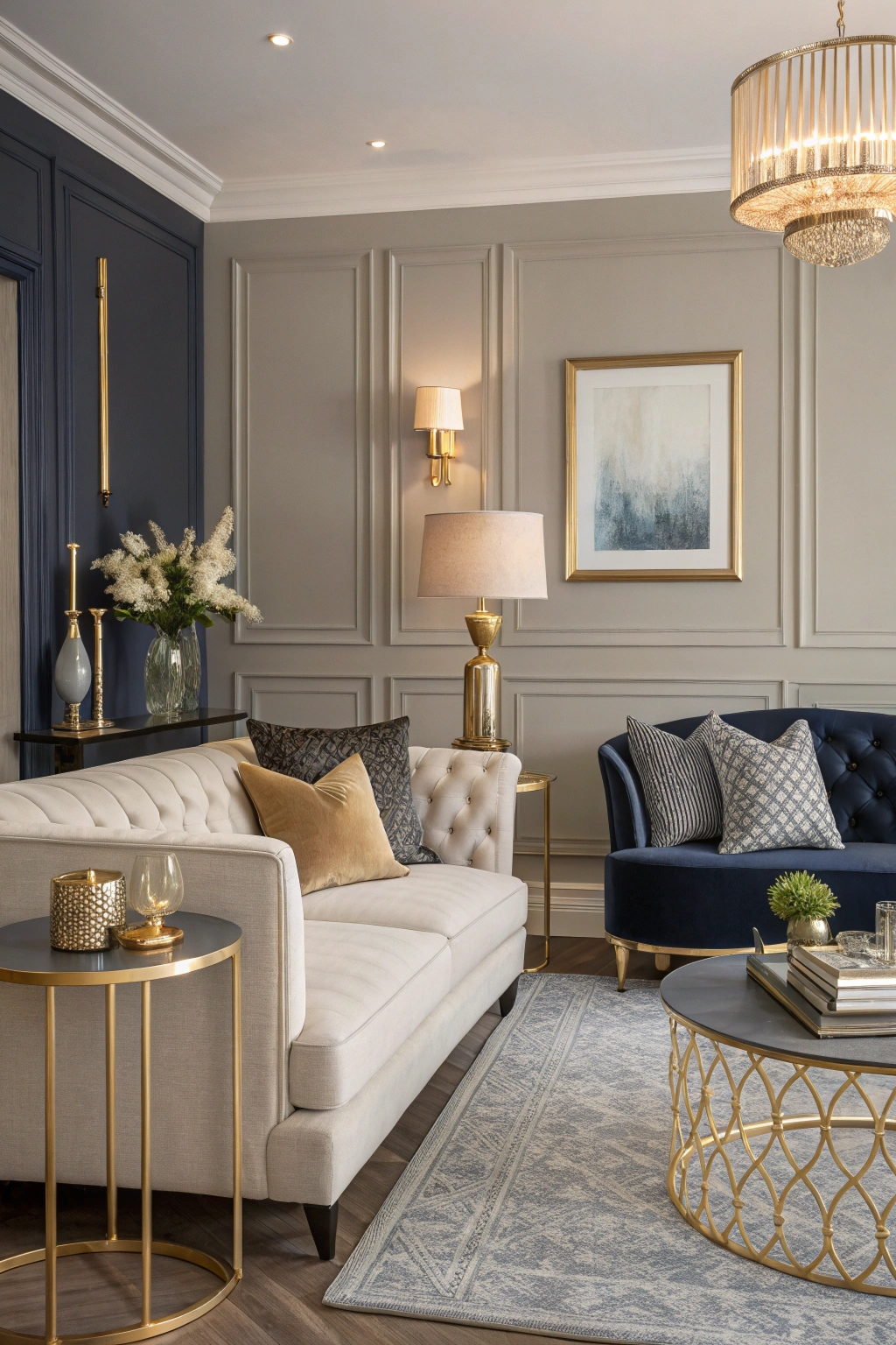 When you step into a living room, the color palette sets the tone immediately. Choose elegant shades like soft creams, muted grays, or deep navy to create a sophisticated atmosphere. You can accessorize with accents in gold or silver to enhance the sophistication. Combining these colors with warm lighting makes the space inviting, balancing elegance and comfort effortlessly.