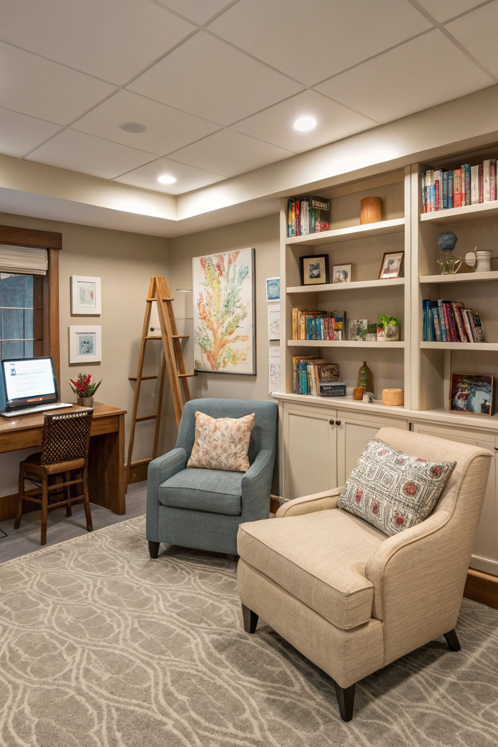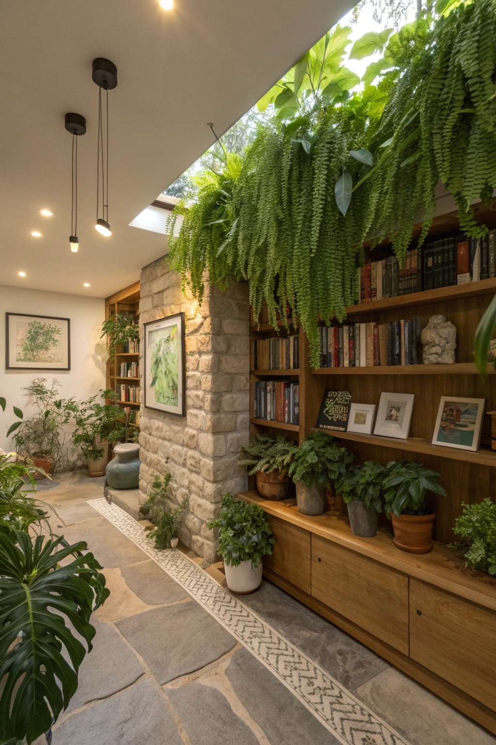 Soft lighting sets the perfect stage to bring nature indoors, which can enhance the tranquil vibe of your home library. Incorporate lush greenery with potted plants and hanging ferns to purify the air. Use natural materials like wooden shelves and stone accents for a warm touch. You could also display botanical prints or nature-themed artwork to inspire creativity and foster a calming atmosphere.