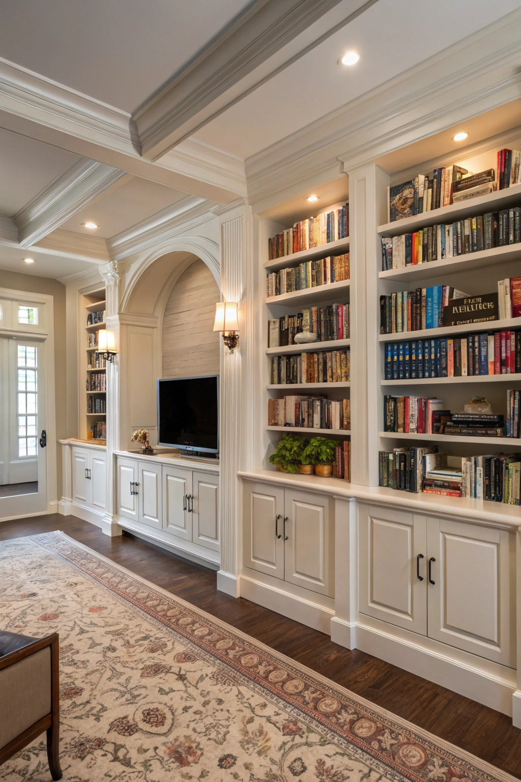 How can built-in bookcases transform your home library into a stylish sanctuary? By seamlessly integrating your books into the architecture, you create a sleek look that maximizes space. Choose floor-to-ceiling designs for visual impact and add hidden lighting to showcase your collection. With customizable shelves, you can easily organize by genre or color, making the library both functional and inviting.