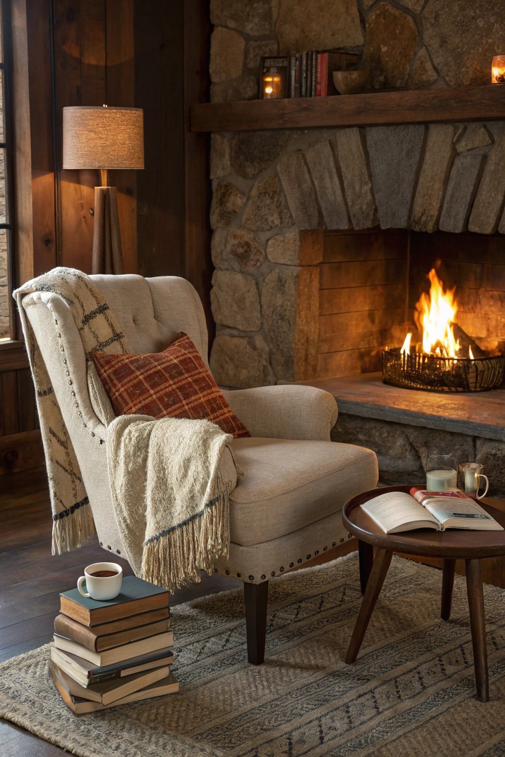 Imagine curling up with your favorite book next to a warm, crackling fireplace—that’s the essence of a cozy fireplace reading area. Choose a comfortable chair or a plush throw for extra warmth. Arrange a small side table for your coffee or tea, and keep a stack of books within reach. With a soft rug underfoot, you’ll create the perfect retreat for reading bliss.