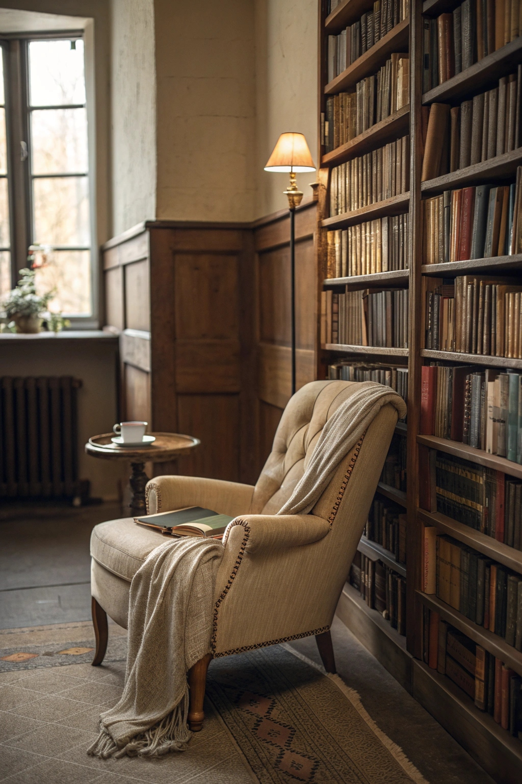 Nestled in a corner of your cozy library, a vintage armchair can become the perfect sanctuary for reading and relaxation. Its worn fabric and inviting curves beckon you to settle in with a good book. Add a soft throw and a small side table for your favorite beverage, creating an intimate space where you can escape into stories and unwind from the day.