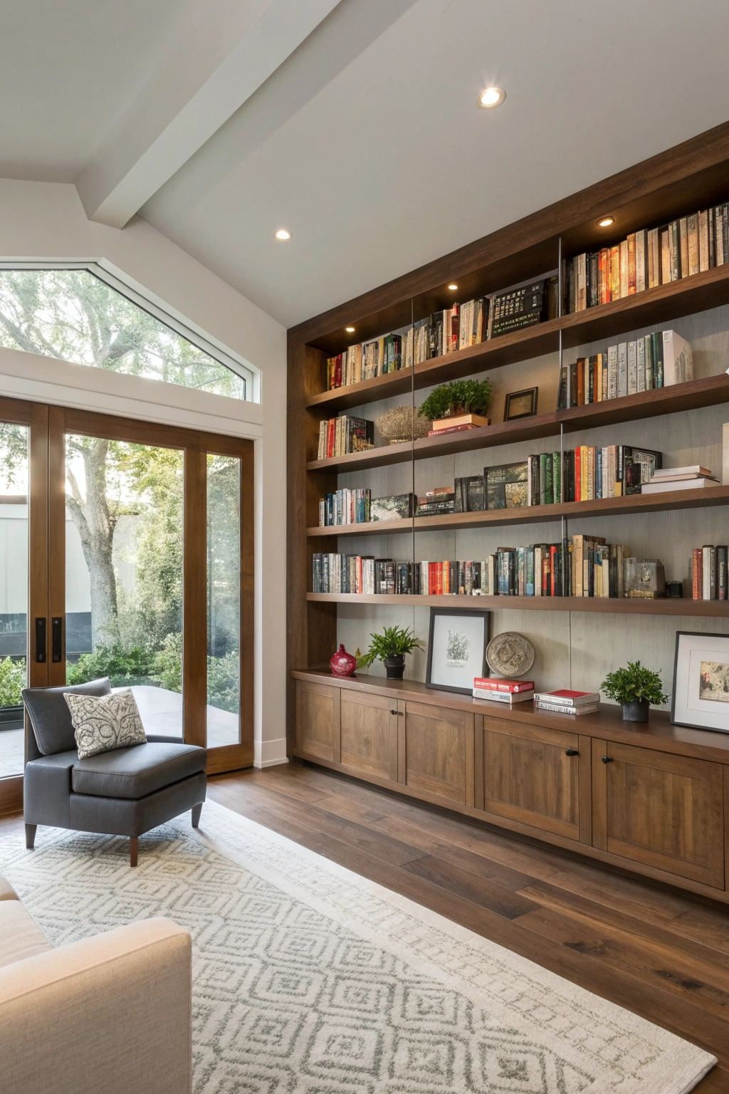 Transform your cozy library with a stunning wall-to-wall bookcase that showcases your favorite literary treasures and personal mementos. This design maximizes your space, creating an inviting backdrop for reading. Use a mix of open and closed shelving to display books, art, and photos. Choose matching accessories or colorful accents to enhance the overall aesthetic, making your library a true reflection of you.