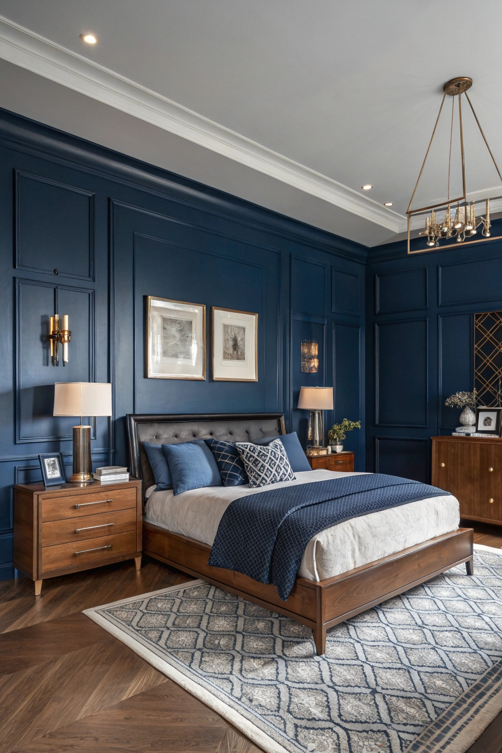 Bold navy blue brings a striking depth to your bedroom, enveloping the space in a rich and sophisticated aura. It creates a calming atmosphere, perfect for relaxation. When you choose this color, you’ll find that it: