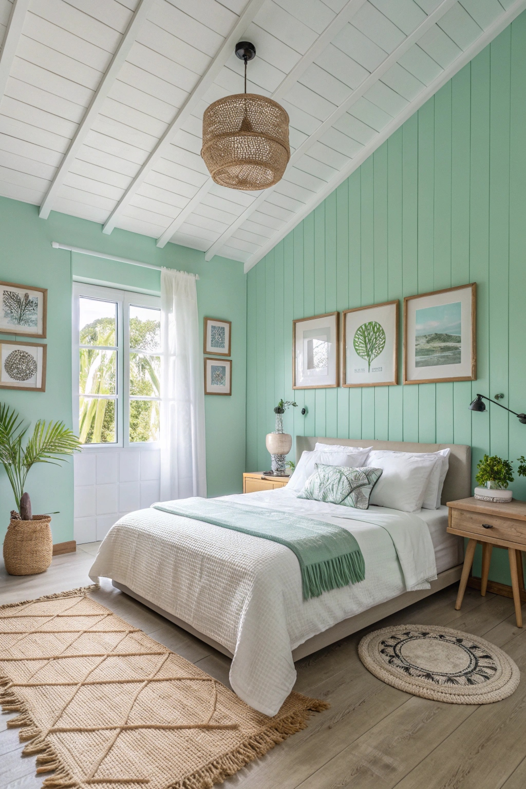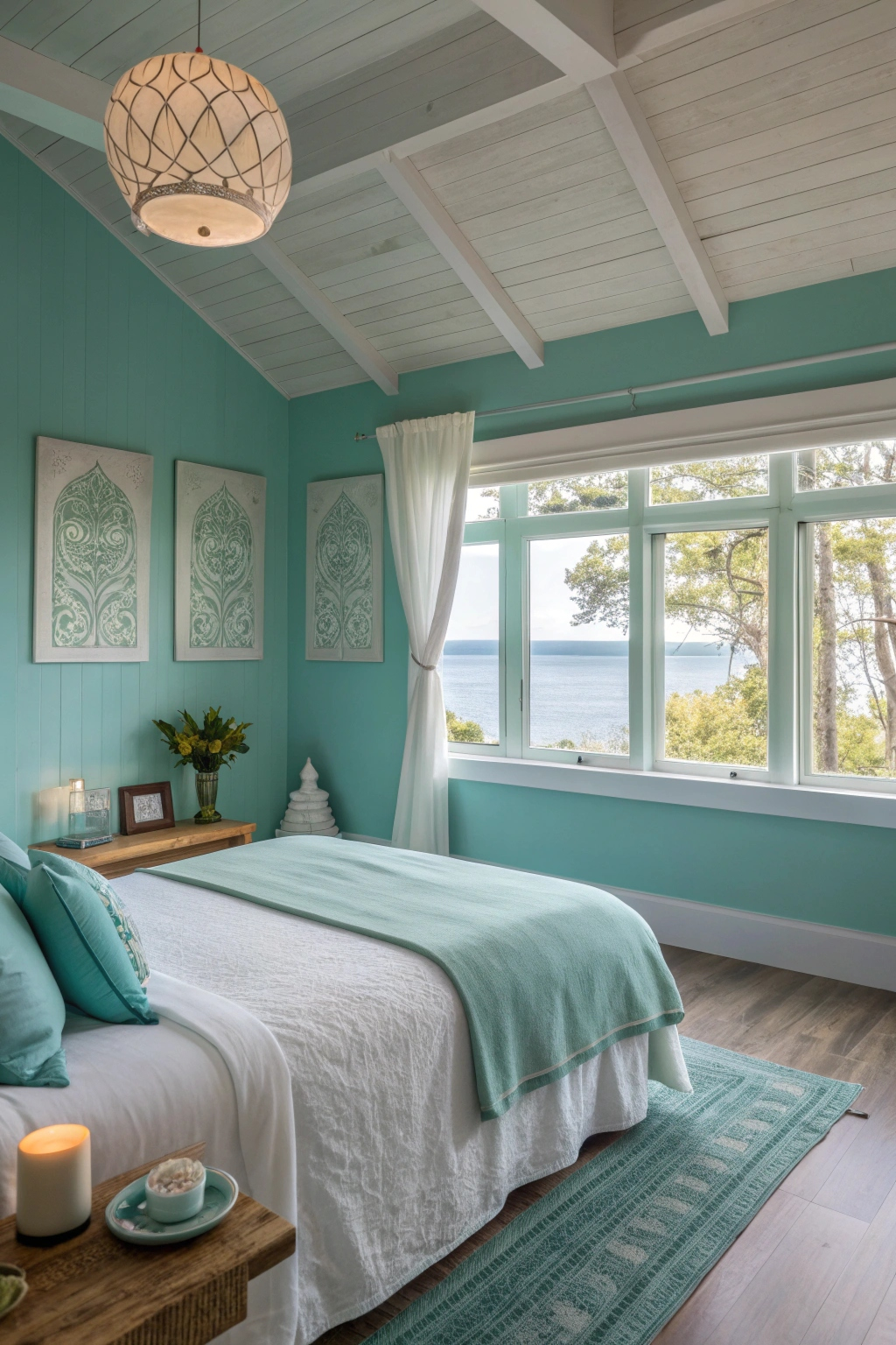 Tranquility blossoms in a bedroom painted in calm aqua, creating a serene retreat that soothes the mind and spirit. This invigorating hue brings a sense of peace and revitalization to your space. Embrace its uplifting qualities and transform your bedroom into a sanctuary.