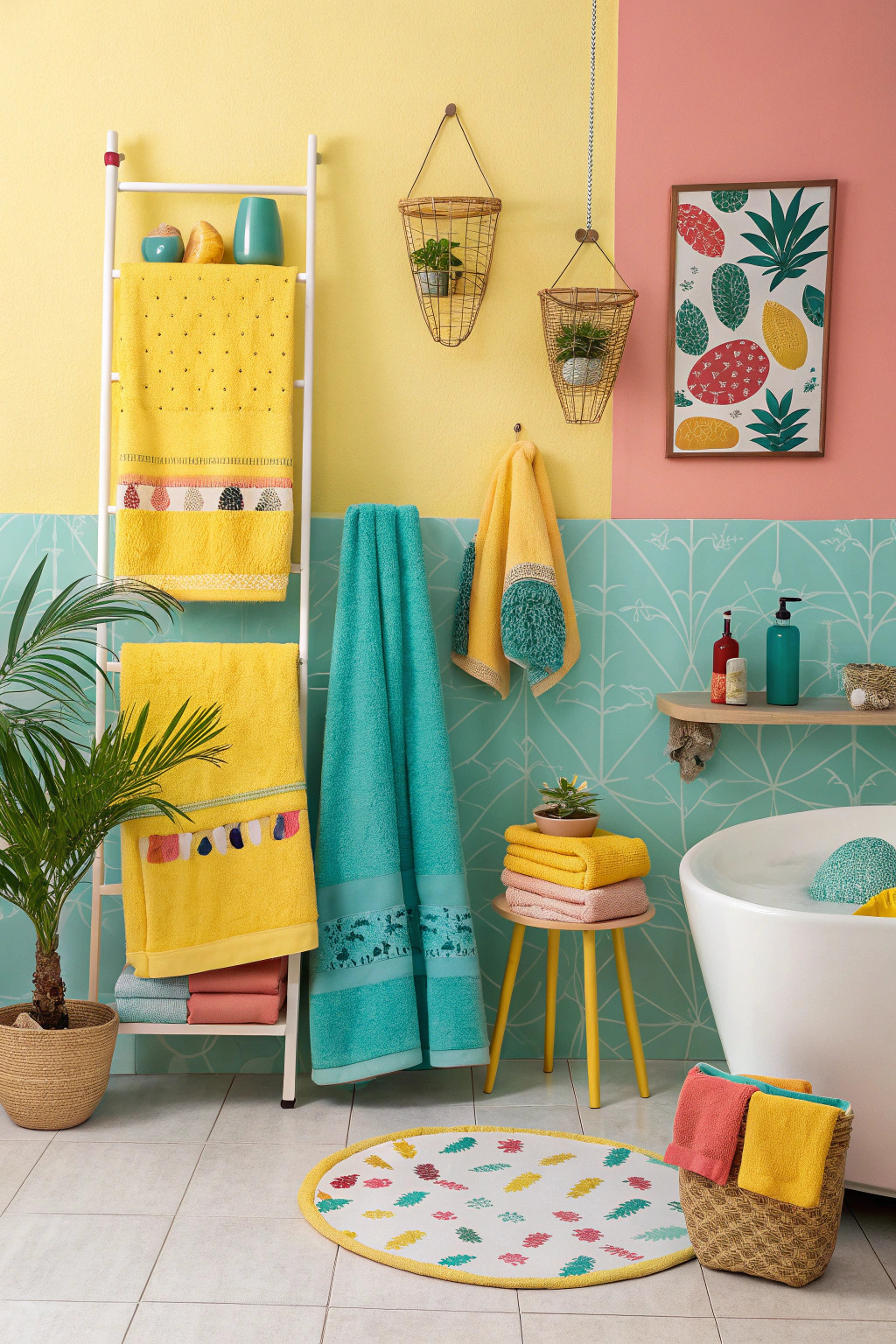 Brighten your bathroom with vibrant towels in shades of yellow, turquoise, or coral. Pair them with tropical-themed accessories for a fresh summer vibe.