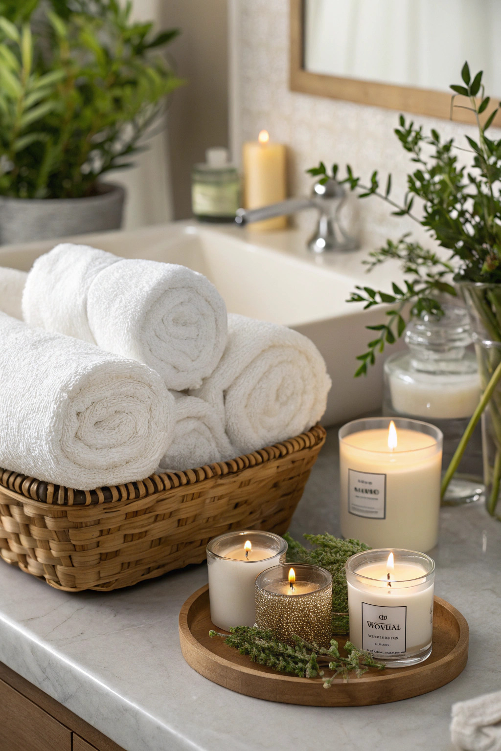 Create a spa-like ambiance with plush white towels, scented candles, and greenery. Rolled towels in a basket, along with a few luxury bath products, can transform your bathroom into a relaxing retreat.