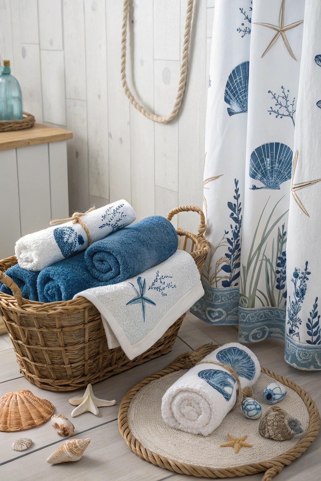 For a nautical theme, choose blue and white towels. Add seashells, a marine-themed shower curtain, and rope accents to complete the look. Rolled towels in a wicker basket enhance the coastal feel.