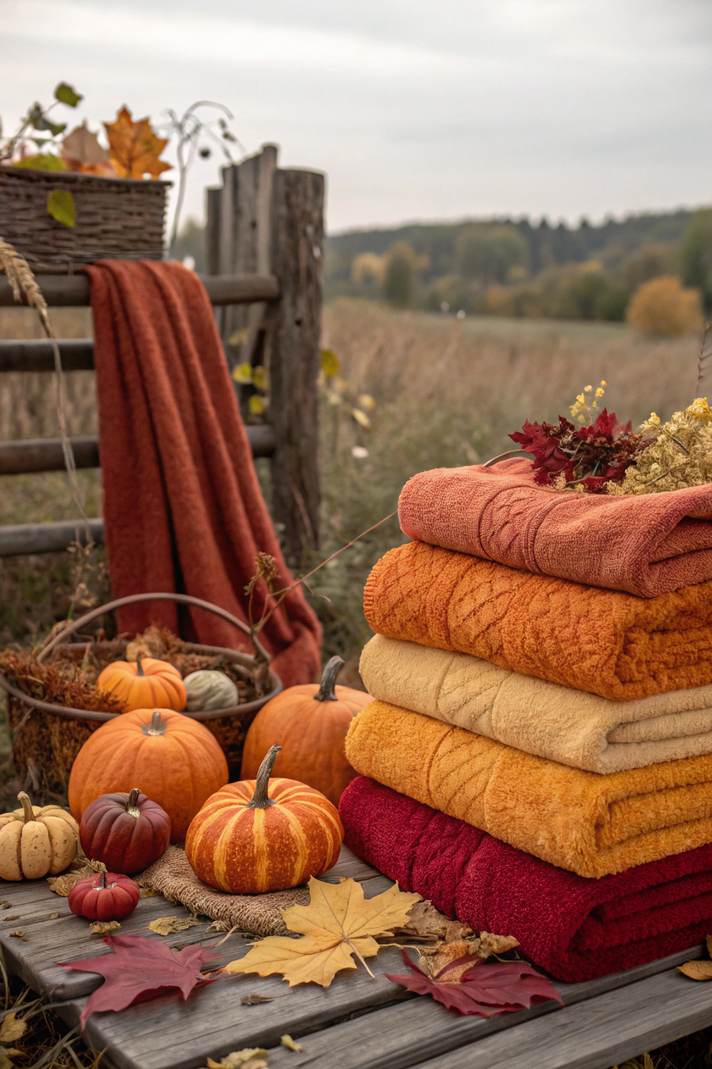 For autumn, choose towels in warm, earthy tones like burnt orange, mustard yellow, or deep red. Pair with autumnal accessories such as pumpkins, leaves, and cozy textures.