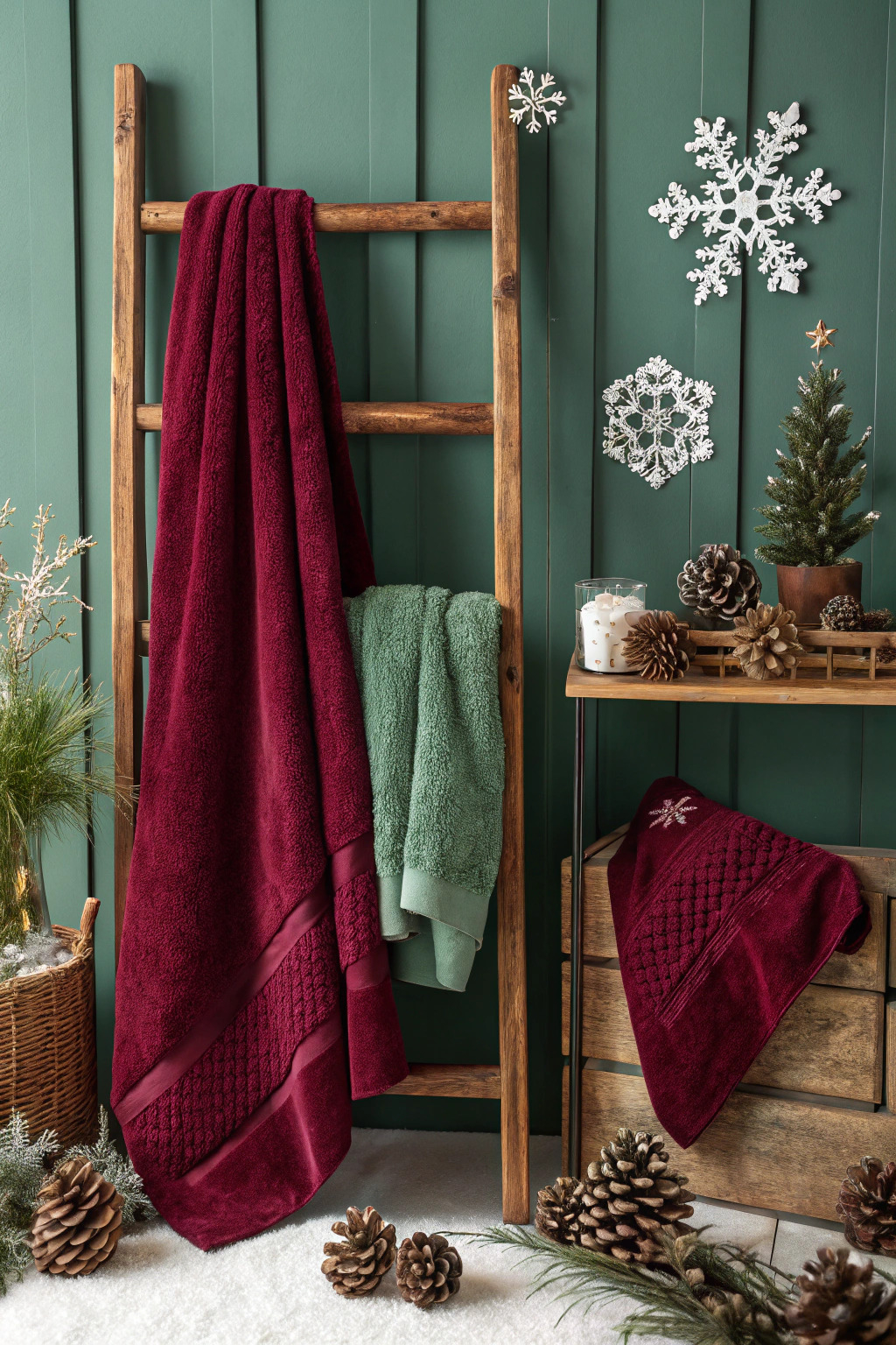 In winter, opt for deep, rich colors like burgundy or forest green. Soft, fluffy towels add warmth and comfort. Complement them with winter-themed décor such as pinecones or snowflake accents.