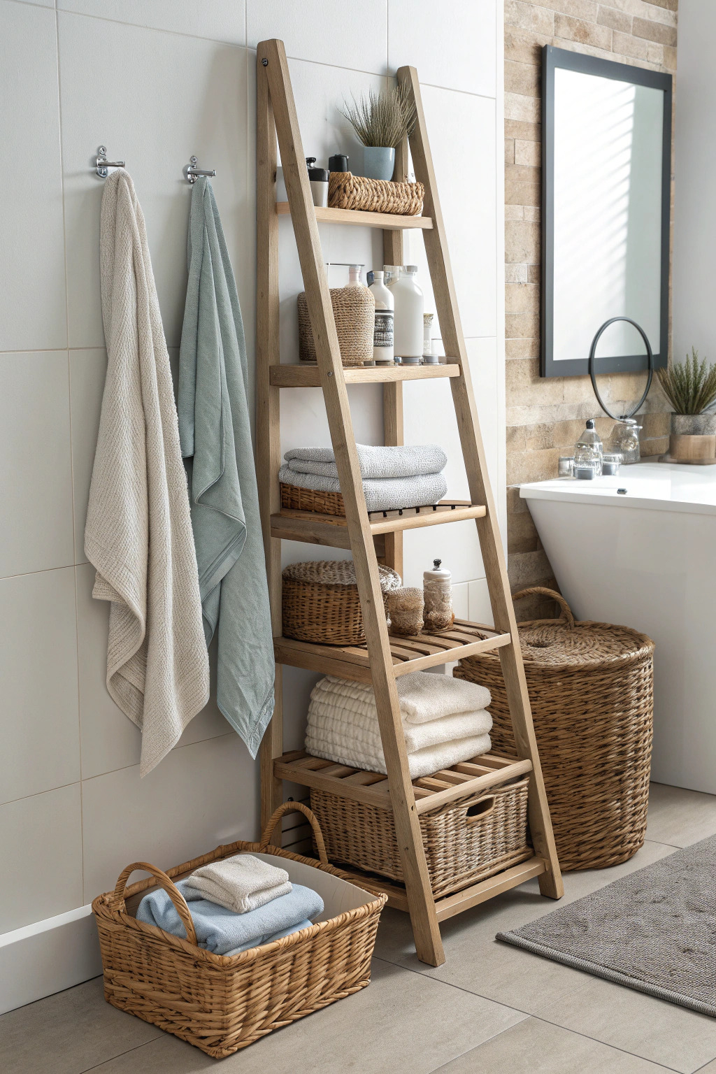 Ladder shelves are trendy and functional. Drape towels over the rungs or use baskets on the steps to store your towels. This adds a vertical element to your storage, making use of often-overlooked space.