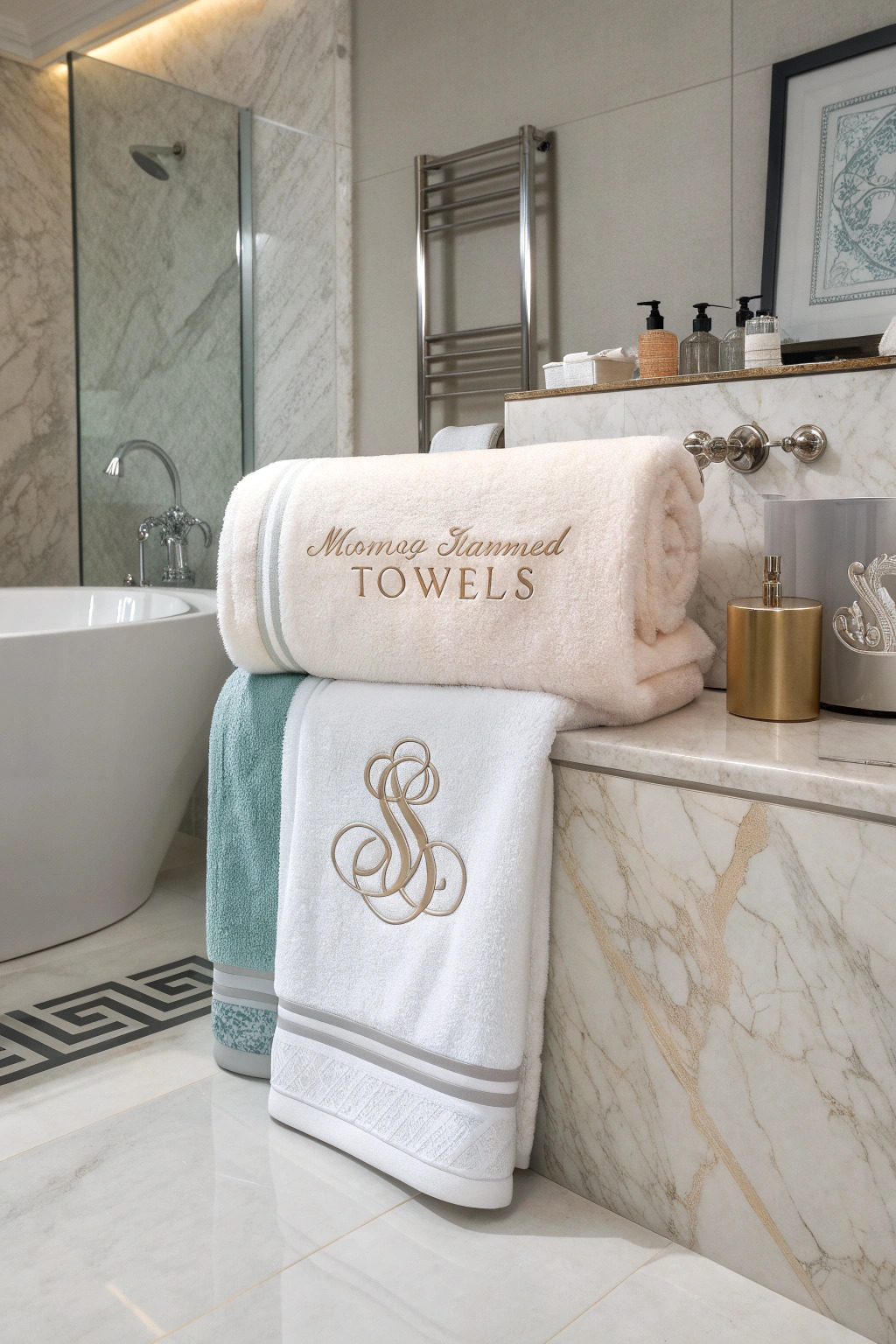 Monogrammed towels add a personal touch and a sense of luxury. Choose fonts and colors that match your bathroom décor for a custom look.