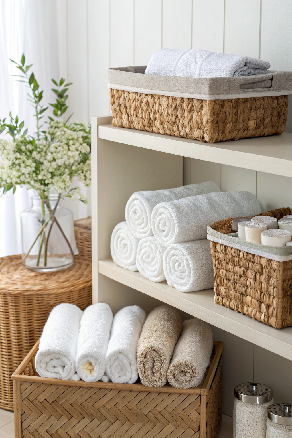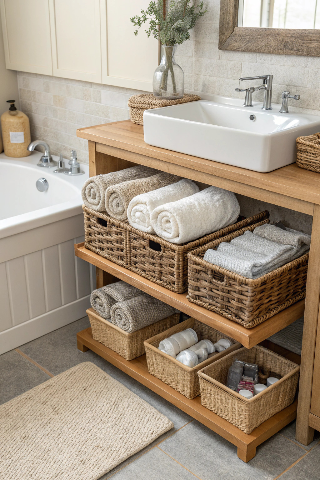 Wicker baskets or fabric bins can store rolled towels attractively. Place them under the sink, next to the bathtub, or on shelves for easy access and a cozy look.