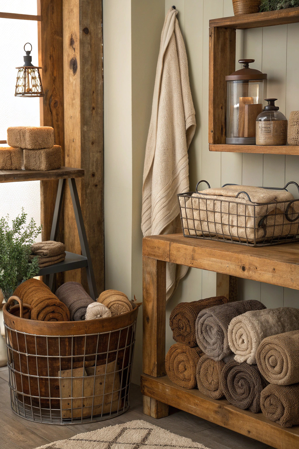 Rustic charm can be achieved with earth-toned towels, wooden accents, and vintage décor. Rolled towels in a wire basket or on wooden shelves add to the rustic aesthetic.