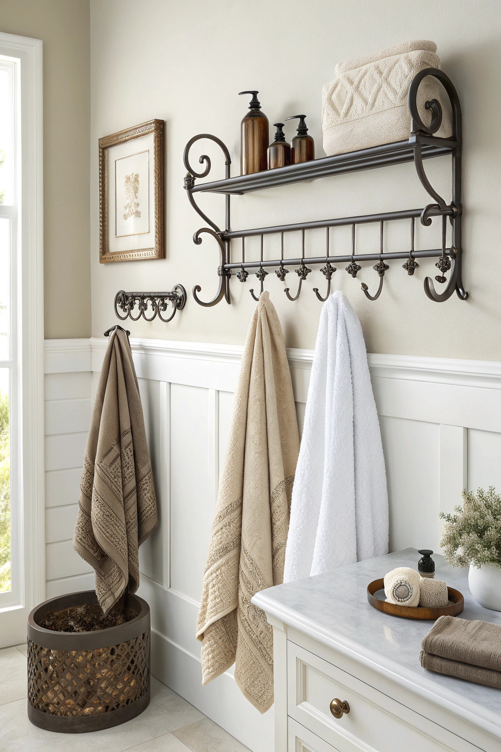 Towel racks and hooks are practical and stylish. Choose designs that match your bathroom’s theme. Vintage hooks add charm, while sleek, modern racks contribute to a contemporary look.