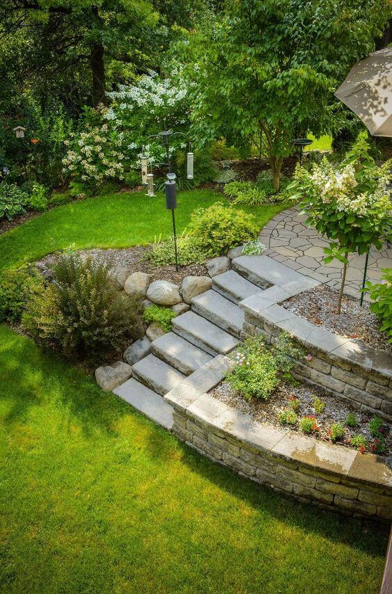 Here, stone steps transform a steep slope into a graceful, welcoming pathway that blends right into the garden. The retaining walls not only support the structure but also double as planting beds for flowers and low shrubs, softening the solid stone with natural charm.