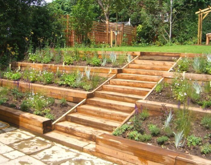 To build something similar, install terraced beds with pressure-treated timber or sleepers, which keep soil in place and create planting areas.