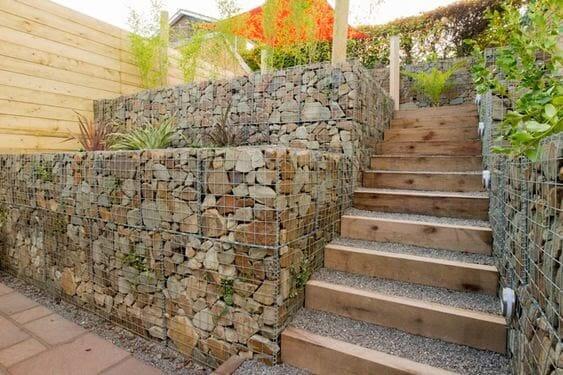 To recreate this, use gabion cages, fill them with stones of mixed sizes, and install timber steps for a natural contrast. Once complete, you can style the upper terrace with potted plants, seating, or even a shaded nook for relaxing.