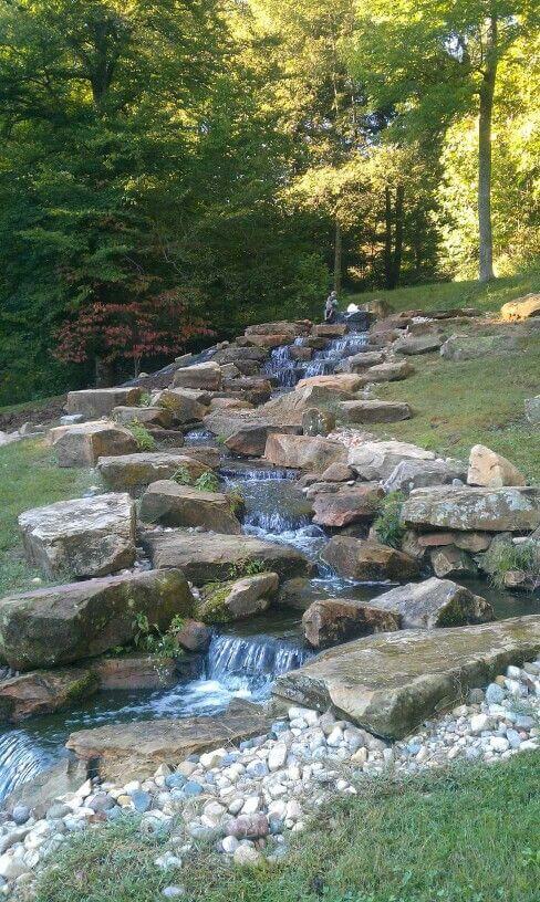 The rocks are placed to guide the water while also adding stability to the hillside. Small pockets of moss and greenery peek between the stones, softening the rugged look and blending it into the landscape.