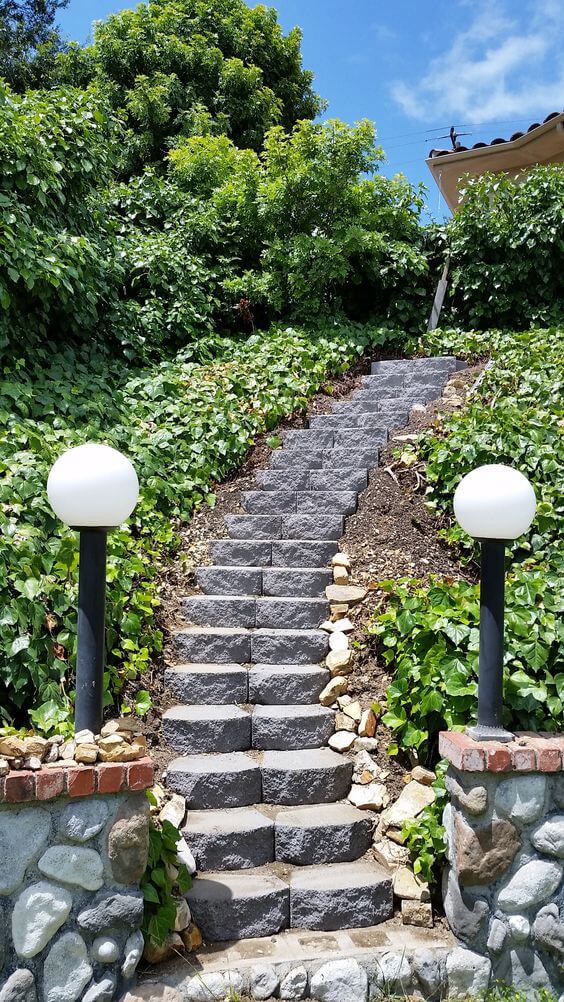 Paired with sturdy rock pillars and classic globe lights, it brings a touch of formality to a natural hillside. You can recreate this look by using concrete or stone pavers, securing each step firmly into the slope to prevent shifting.