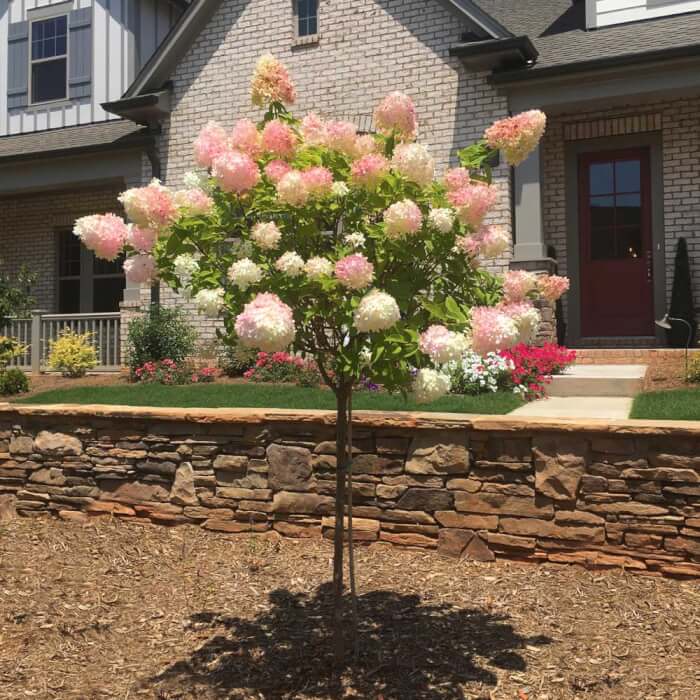 Tree hydrangea is a hardy shrub that delivers giant cone-shaped blooms each summer. The flowers start white, then gradually turn pinkish-brown, lasting until frost.