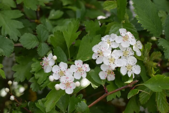 Hawthorn trees combine beauty and toughness with their thorny branches and clusters of fragrant flowers. Depending on the variety, blossoms may be red, pink, or white. They appear in mid to late spring and often attract birds and pollinators.