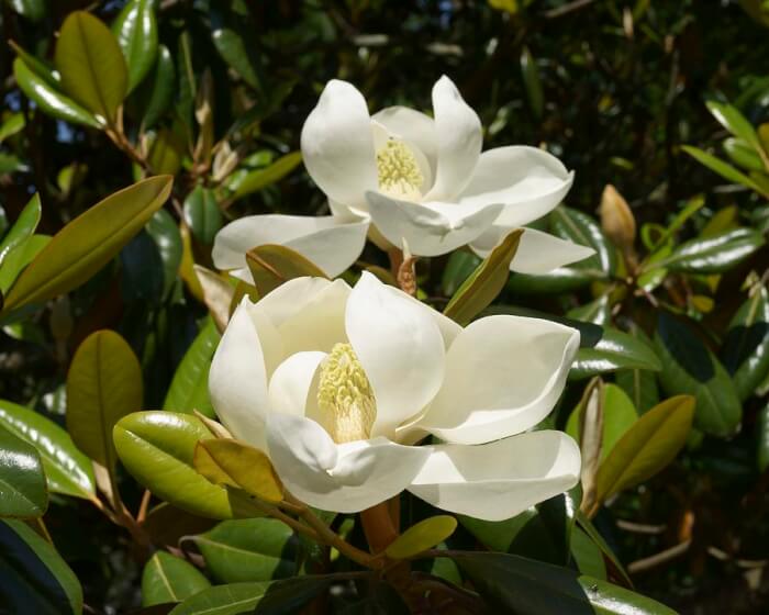 Southern magnolia is a timeless classic with large, creamy white flowers and glossy green leaves. The blooms are strongly fragrant and appear in late spring through early summer.