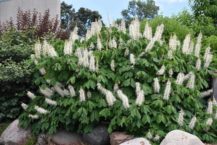 Bottlebrush Buckeye is a summer stunner with tall white flower spikes that rise above its foliage. The blooms are especially appealing to hummingbirds and butterflies.