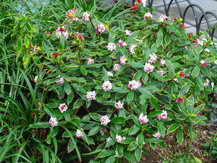 Winter Daphne blooms in late winter or early spring with clusters of pink buds that open into fragrant white flowers. It’s best planted near entryways or paths so you can savor the scent as you pass by.