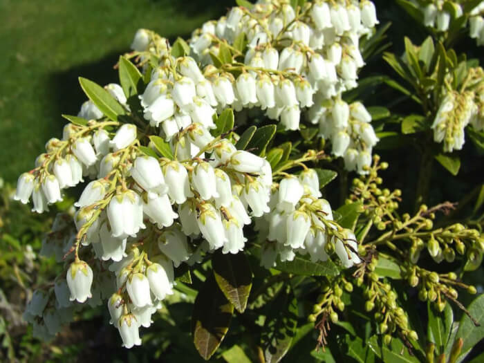 Pieris greets early spring with clusters of dangling, bell-shaped flowers. The blooms emerge from red buds and mature into soft pink or white blossoms. It thrives in partial shade with acidic, well-drained soil.