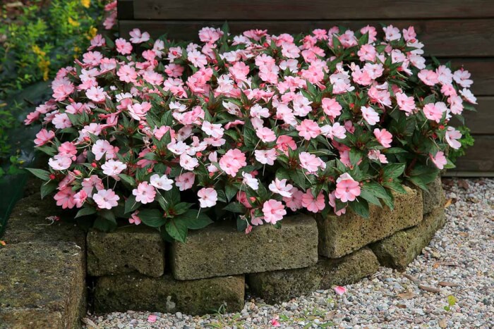 Impatiens brighten shady paths with blooms in pink, red, purple, and white. They do best in fertile soil and are partial to full shade. Water regularly to prevent wilting during hot afternoons.
