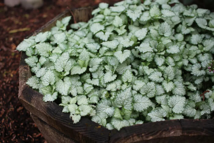 Dead Nettle is a ground cover with silver-patterned leaves and small purple blooms. It thrives in shady spots and spreads quickly to fill edges.