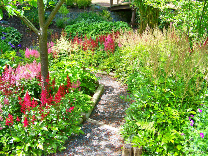 Astilbes bring feathery plumes of pink, red, or white flowers in midsummer. They prefer rich, moist soil and partial shade. Plant them in groups for a cloud-like effect along walkways.