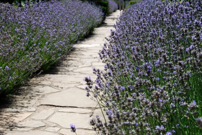 Lavender adds fragrance and color to sunny walkways. It thrives in sandy, well-drained soil with full sun. Prune after flowering to keep plants compact.