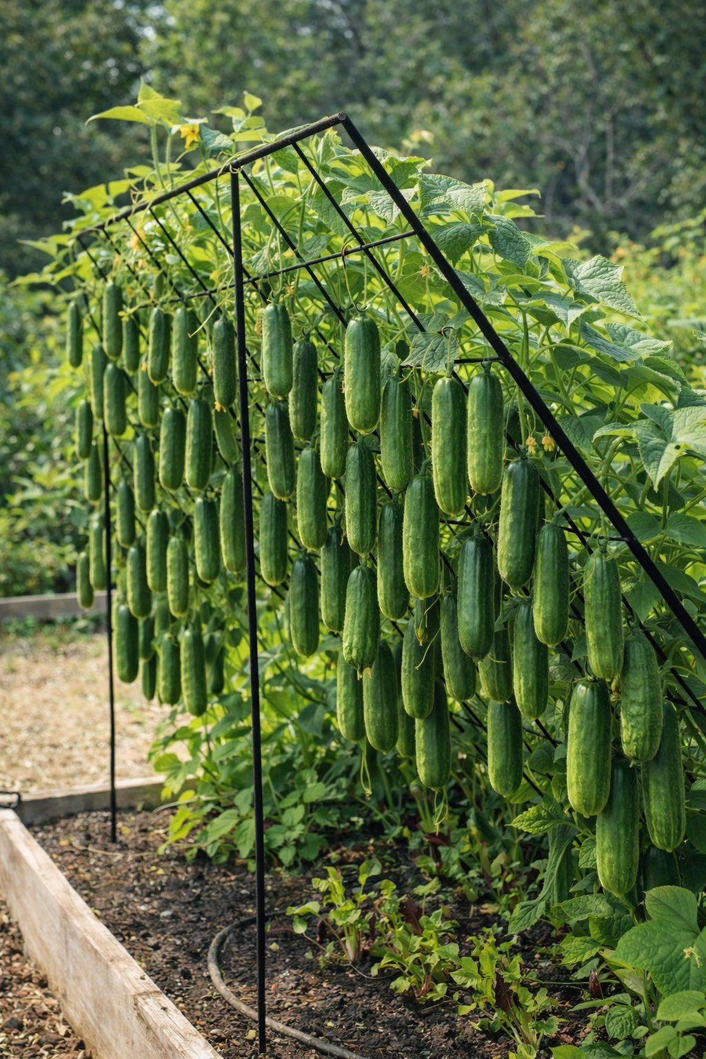 Best – Vertical Abundance: When the Garden Grows Upward This thriving cucumber trellis is a striking example of how thoughtful design can unlock abundance in even the most modest garden space. Rather than sprawling across the ground, the vines climb confidently upward, transforming vertical structure into a living wall of food. The result is both visually impressive and deeply practical. Suspended from the sturdy metal frame, dozens of cucumbers hang straight and uniform, their weight supported by strong vines and careful training. This vertical approach allows sunlight to reach every leaf, improving airflow and reducing disease while encouraging healthier, more productive plants. Each cucumber grows clean and well-shaped, untouched by soil and easy to harvest. The trellis itself becomes part of the garden’s architecture. Its angled form creates a tunnel-like effect, turning a simple raised bed into an immersive growing space. Beneath the hanging fruit, smaller plants thrive in the shade, making efficient use of every inch of soil. This layered planting reflects a natural ecosystem, where different crops coexist and support one another. Beyond efficiency, there is a quiet beauty in this scene. The contrast between dark metal, rich soil, and vibrant green foliage highlights the elegance of purposeful gardening. Yellow blossoms peek through the leaves, subtle reminders that every harvest begins with patience and care. What this garden illustrates best is intention. Vertical growing is not just a technique—it’s a mindset. It shows how working with plant behavior rather than against it leads to stronger growth and greater yields. By guiding vines upward, the gardener creates order without restricting nature’s instinct to climb, stretch, and flourish. In a world where space is often limited, this trellis stands as proof that abundance is not about size, but about strategy. With the right structure, attention, and respect for how plants grow, even a small garden can produce generously—offering food, beauty, and the quiet satisfaction of watching effort turn into harvest. #fblifestyle | Facebook