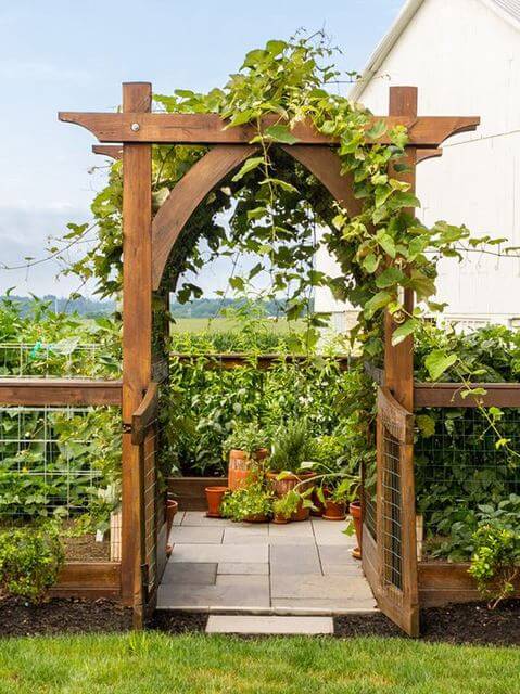 This wooden arbor adds a strong and elegant touch to a vegetable garden. The arched top feels classic, while climbing vines soften the frame with lush greenery.