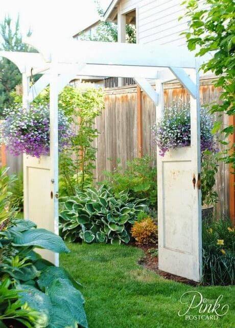 This sweet garden arbor uses two old doors and a few wooden beams to create a playful and inviting entryway. The white paint and hanging flower baskets add a soft, romantic touch that brightens up any garden corner.