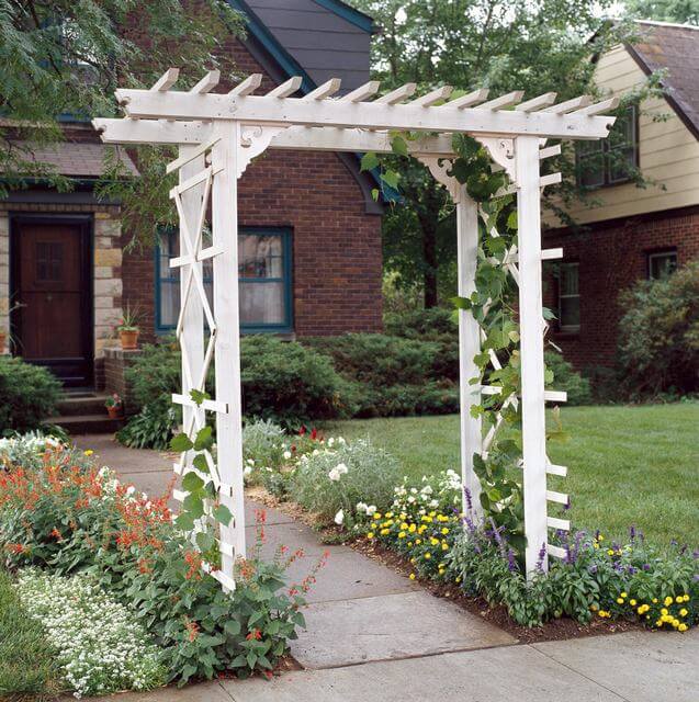 To build this look, use basic wooden posts with an arched beam across the top, then paint it in a bright outdoor color. Plant roses or other flowering vines at the base and let them trail over the arch for a lush, blooming finish.