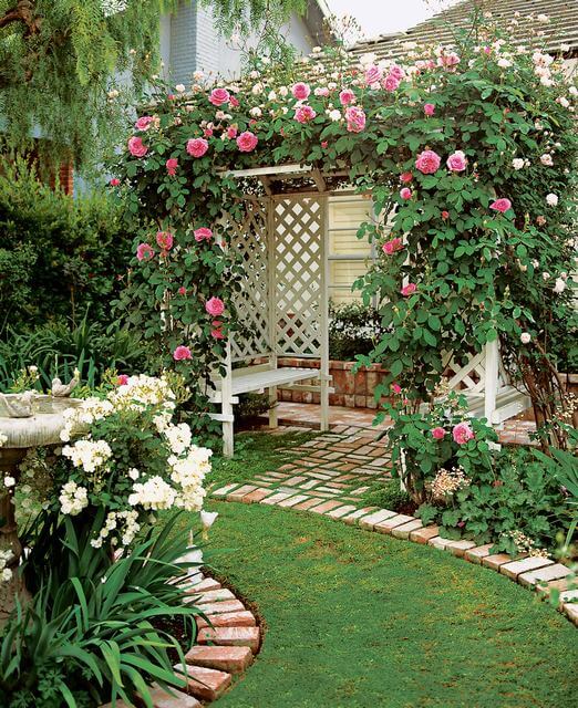 This rose-covered garden arbor feels like something out of a dream. With lattice sides, a cozy built-in bench, and overflowing pink blooms, it turns any garden corner into a peaceful retreat.