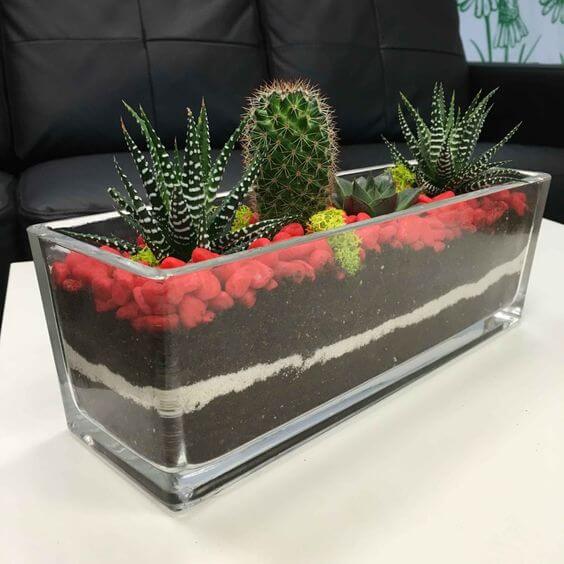 If you’re looking for something bold yet easy to care for, this sleek terrarium garden is a perfect pick. The clear rectangular glass lets you show off those beautiful soil layers, and the splash of red pebbles adds a fun, modern twist.