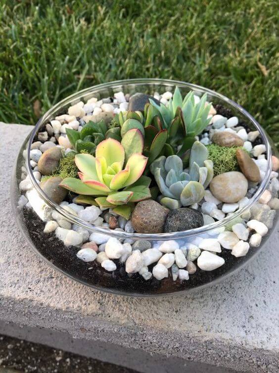 To make your own, start with a shallow glass container, add cactus soil, and layer decorative stones on top. Mix in a few succulents of different shapes and colors for variety.