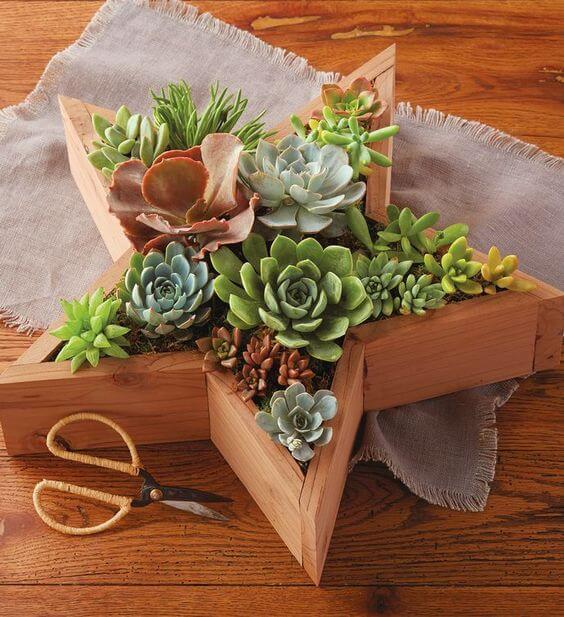 To make your own, use a wooden star frame or build one with basic craft wood, line it with landscape fabric, and fill with cactus soil. Tuck in a mix of colorful rosettes and trailing succulents for extra dimension.
