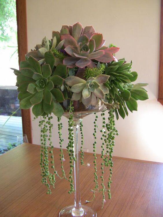 You can make one by filling the bowl of a large glass with cactus soil, gently tucking in a variety of succulents, and letting trailing types hang over the edge. It works best in a bright spot but away from harsh sun.