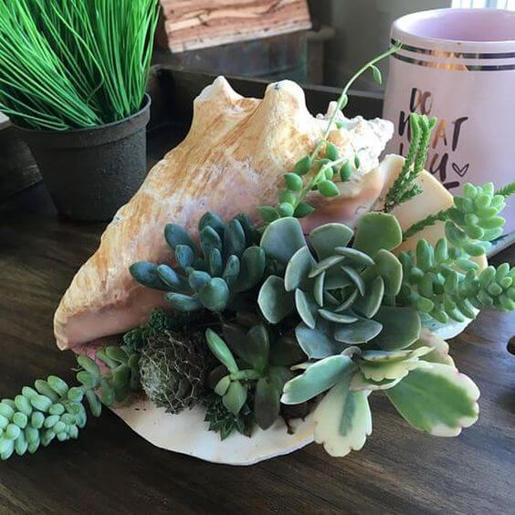 This sea-inspired succulent garden brings beachy vibes straight to your table. Nestled inside a large conch shell, the soft greens and trailing textures look like they’re spilling out from the ocean itself.